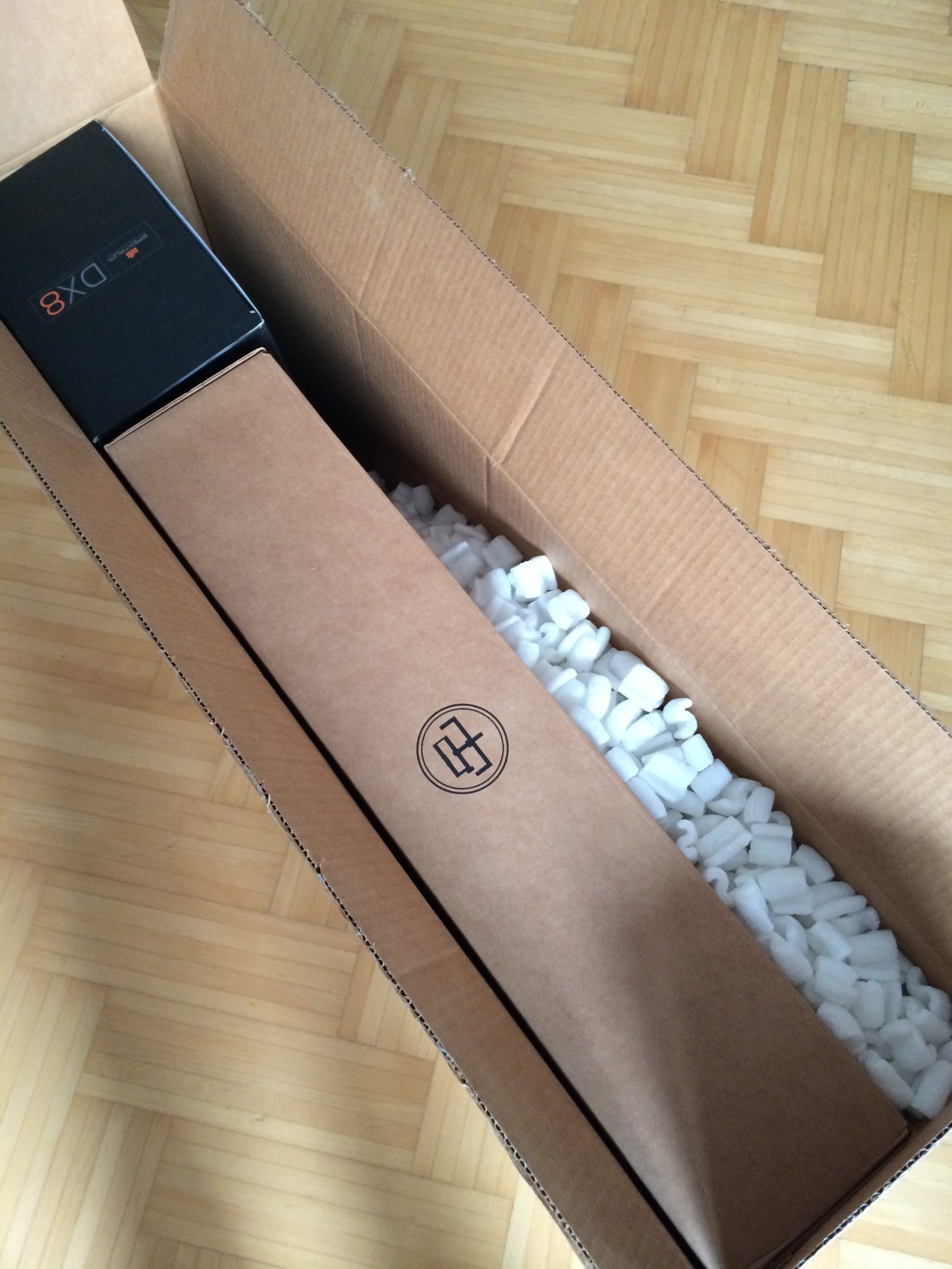The M5 comes in a nice paperboard box with fitted foam rubber in it. The exact measurements of the rectangular foam rubber cover as shown in the picture on the left is 50,5cm x 48 cm. (The cover fits the below foam rubber). In addition the compartment from the stand on the right is another 17cm x 48cm (inner measurements). The height of the box is 14,5cm. Nevertheless, you might wanna invest in a Pelican case or similar to have it safe for traveling, and also have more space for the additional controller, monitors, etc.
